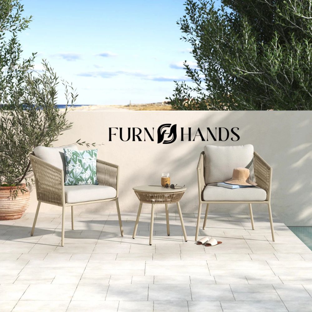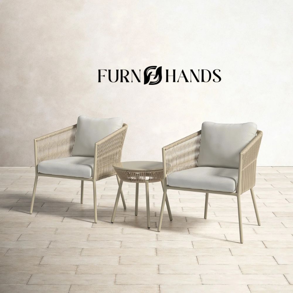 Outdoor patio furniture set India, balcony furniture set, garden table and chairs, rope chair set, outdoor seating set, 2 chairs and table set, modern outdoor furniture India, braided rope outdoor set, Furnhands furniture, premium outdoor furniture online India.